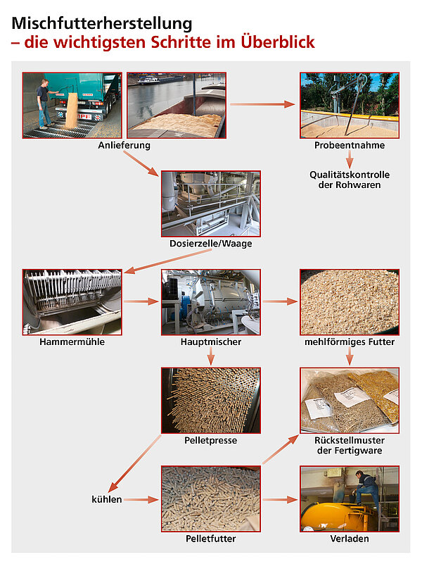 In nahezu allen Mischfutterwerken finden sich vergleichbare Abläufe und Prozesse. Alle Prozessschritte lassen sich in der technischen Umsetzung und Prozessführung individuell variieren - das ist auch Teil des firmenspezifischen Know-hows. Beim gleichen Ziel, dem Landwirt ein hochwertiges und kostengünstiges Mischfutter bereitzustellen, gibt es in der Praxis vielgestaltige Lösungen. Jedes Mischfutterwerk stellt streng genommen eine eigenständige technische Lösung dar. Die Basistechnologie hingegen unterscheidet sich in den einzelnen Werken kaum und ist nachfolgend als typisches Anlagenschema abgebildet.